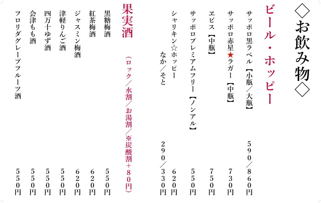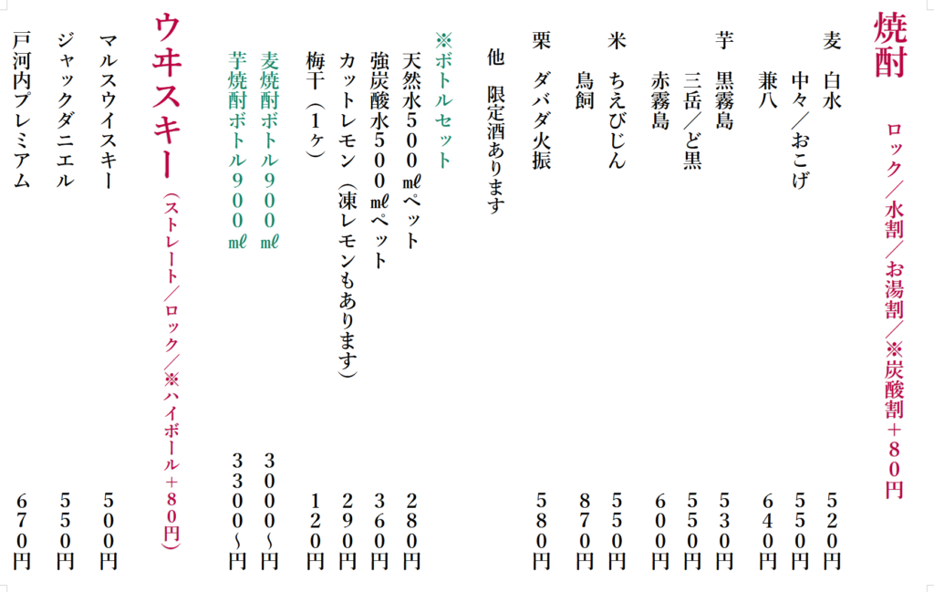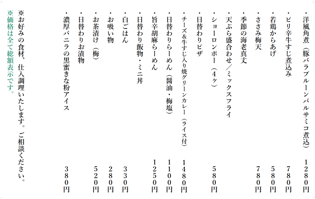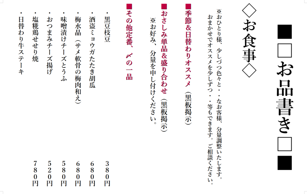常備単品メニュー。おひとり様向けのおつまみセット等もご用意します。